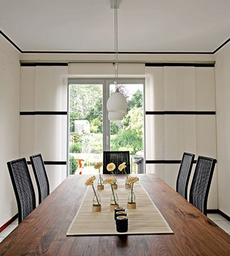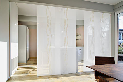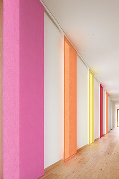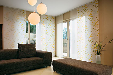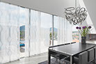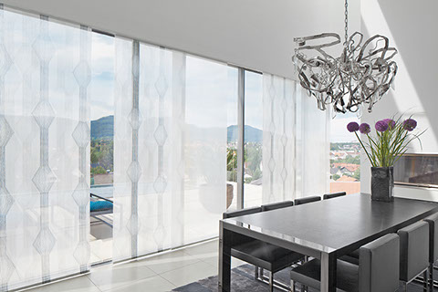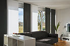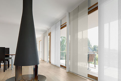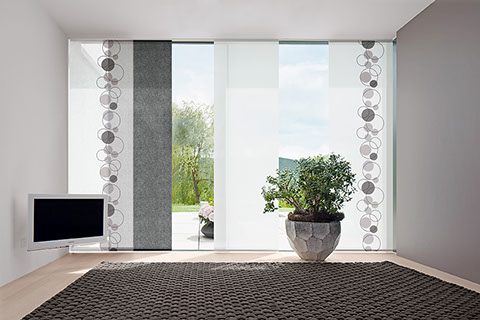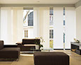 Eine reduzierte und puristische Inneneinrichtung ergänzen  Flächenvorhänge perfekt. Besonders gut eignen sie sich für bodentiefe Fenster und große Fensterfronten, um den dort vorhandenen Lichteinfall zu dosieren. Ganz nach individueller Planung und architektonischen Gegebenheiten kann dieses System mit einer unterschiedlichen Anzahl von Paneelen, verschiedenen Paneelbreiten und vielfältigen Behangvarianten ausgestattet werden.